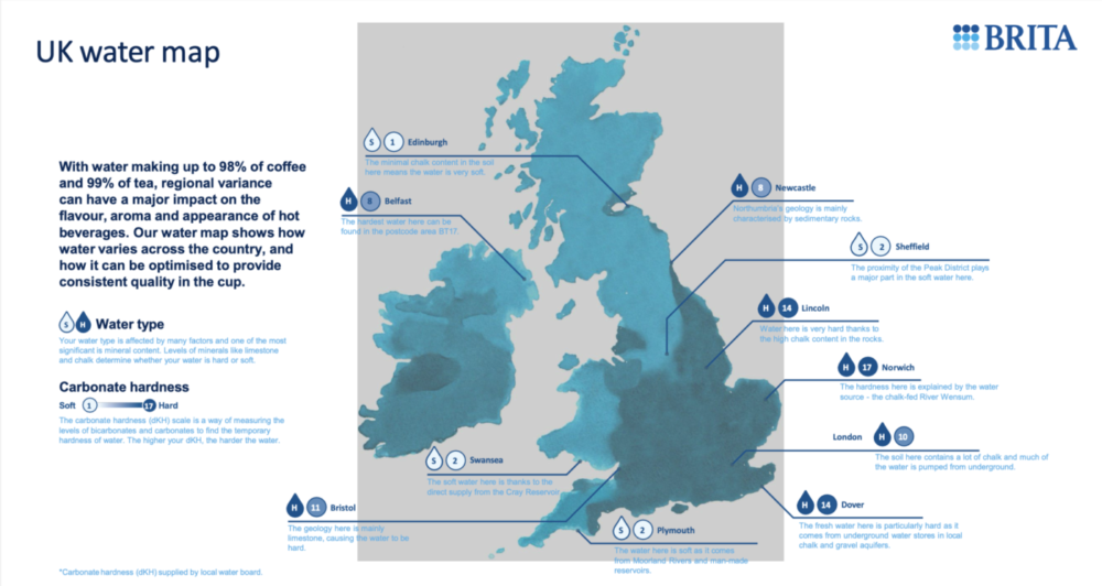 The type of BRITA filter your coffee shop will need depends on both 1. the hardness and chemical makeup of your water and 2. the volume of water your shop will go through. Finding out which type of treatment your water needs is a relatively simple process. First, you can view the general hardness for your area in the UK by searching on the map below, provided by BRITA. This gives you a great overview of which filter you’ll need depending on your area.