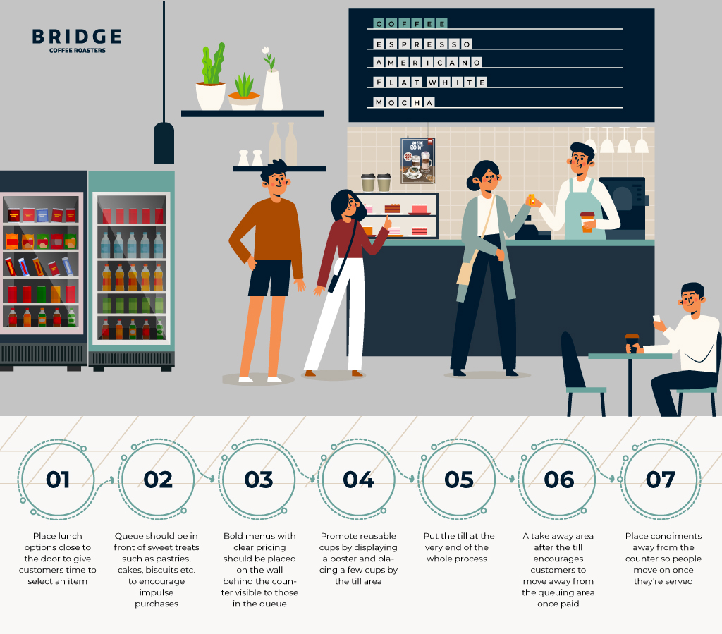 Individual cups of coffee are a very slow way to make a profit: as you know, sales of food and merchandise can boost a shop’s revenue and margin massively. This isn’t going to happen if customers are rushed past, or pushed uncomfortably against, your displays. Nobody wants their customer thinking “never mind, I’ll just grab a coffee, I can buy a sandwich at…”, or “forget it, I’ll check out reusable cups on Amazon tonight”.