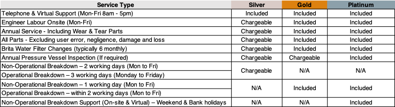 - Silver – Pay as needed, £175 per callout including 30 min on-site labour, £15 per 15 mins thereafter.